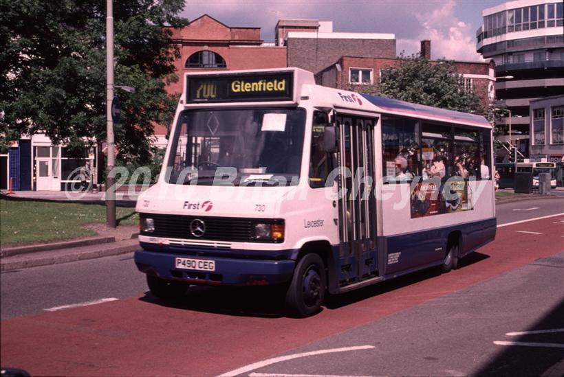This is a Mercedes Benz 811D/Marshall C16. It is fleet number 730. The picture was taken in Leicester on 13/07/2002. This vehicle was previously operated by Centrewest.