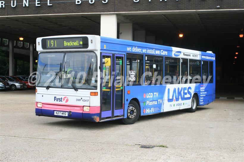 This is a Dennis Dart SLF/Plaxton Pointer. It is fleet number 42417. The picture was taken in Slough on 10/09/2009. This vehicle has been painted in an advert for Lakes.